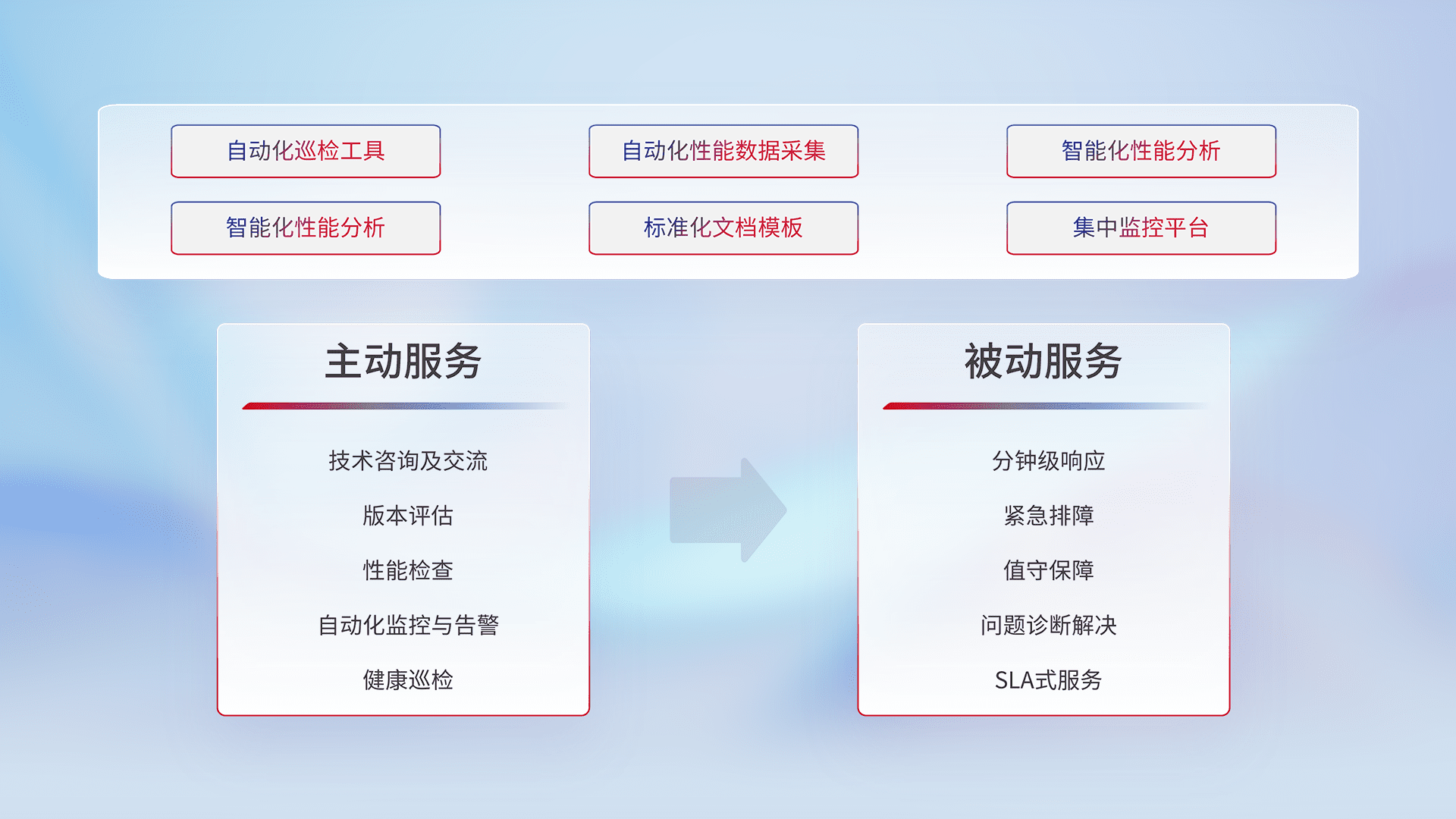 智能化工具和标准化文档,,,,保障服务质量,,提供主动服务(包含技术咨询、、、版本评估、、、性能检查、、自动化监控与告警、、健康巡检)和被动服务包含(分钟级响应、、、紧急排障、、、值守保障、、、、问题诊断解决、、、、SLA服务)。。