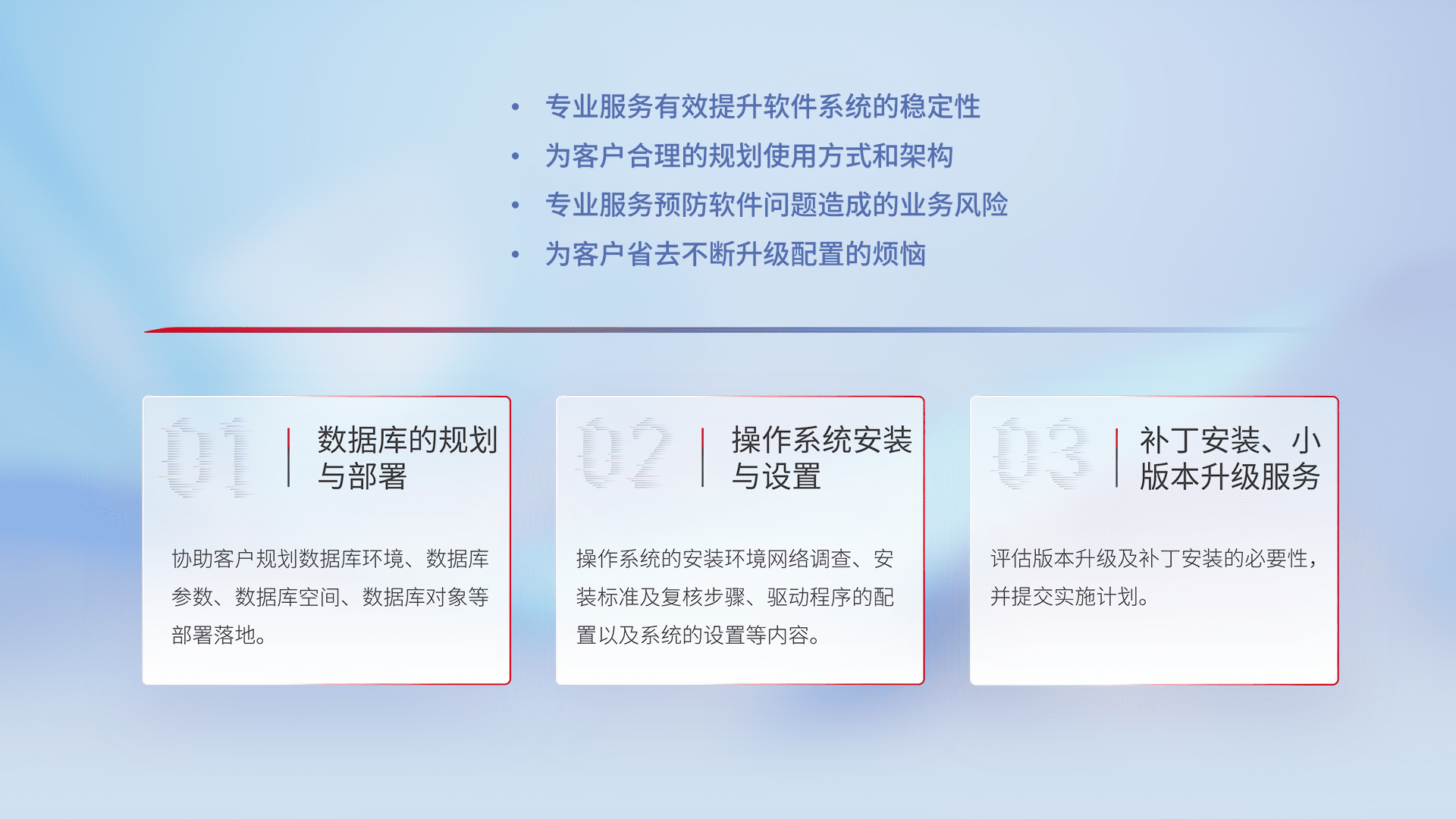 为客户提供软件规模升级、、、、快速部署、、、按需配置的专业服务,,,从数据库的规划与部署到操作系统的安装与设置,,,,再到补丁安装和小版本升级提供支持。。。。